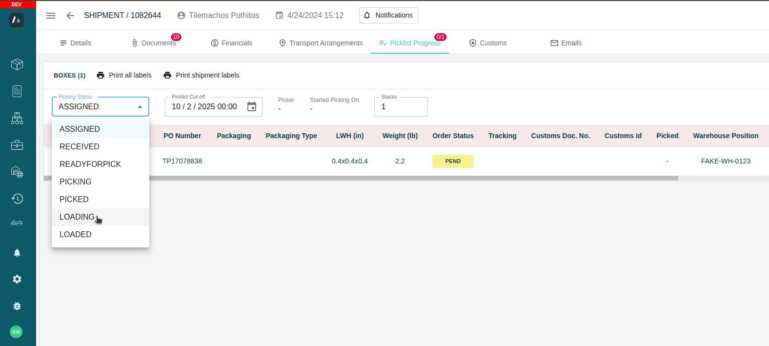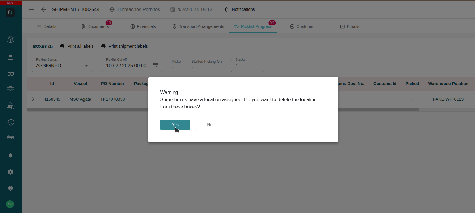 - From there, the warehouse agent can open Picklist Progress and update the picking status to LOADED. If there are positions on the boxes, a pop-up will appear asking if they want to clear them.