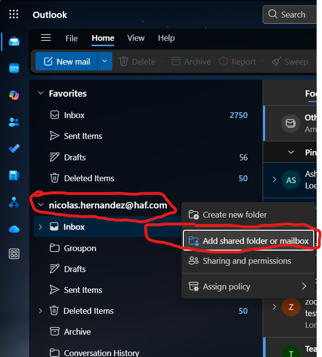 1) Go to your email name on the lefthand side of the screen, right-click, and click on Add Shared Folder or Mailbox.