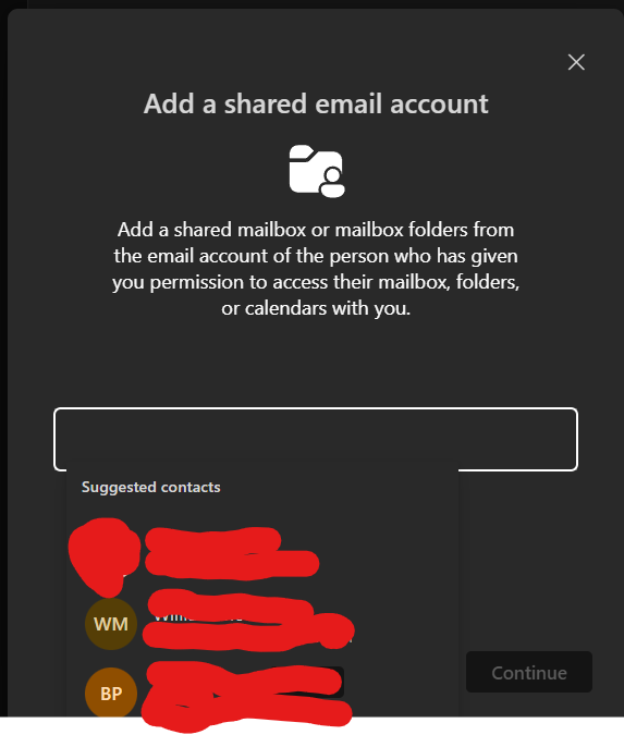 2) From there, a box will open up; type in the shared inbox address, and click the address you want access to and click continue: